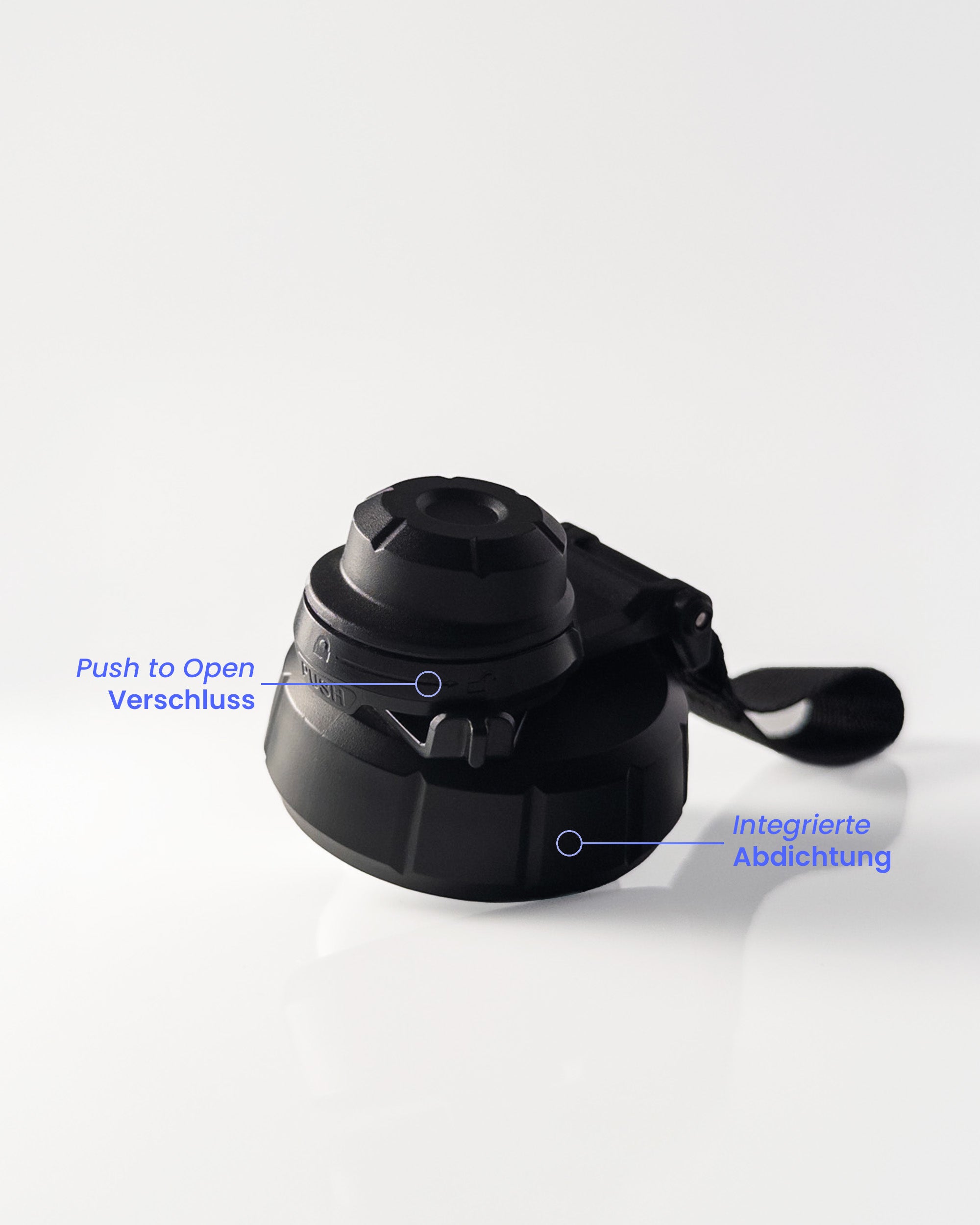 Der Deckel verfügt über eine praktische Push to Open Funktion, mit der er sich per Knopfdruck mühelos öffnen lässt und anschließend wieder auslaufsicher schließt. Zusätzlich kannst du den Button jederzeit über die integrierte Verriegelung sperren und bei Bedarf wieder freigeben.